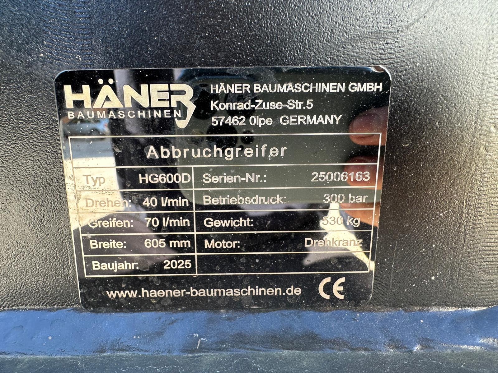 Pinça demolició per a demolicions i classificació de runes, pedra i materials. Ideal per treballar amb precisió. Marca HÄNER model HG600D. Fabricat el 2025. Pes 530 kg. Equipat amb motor de gir. Perfecta per a retro giratòries excavadores de 8T a 14T. Rotatòria 360° Mida oberta 1540 mm. **NOVA A ESTRENAR** Es pot veure i provar. Atenc WhatsApp. www.ecoglobal21.com