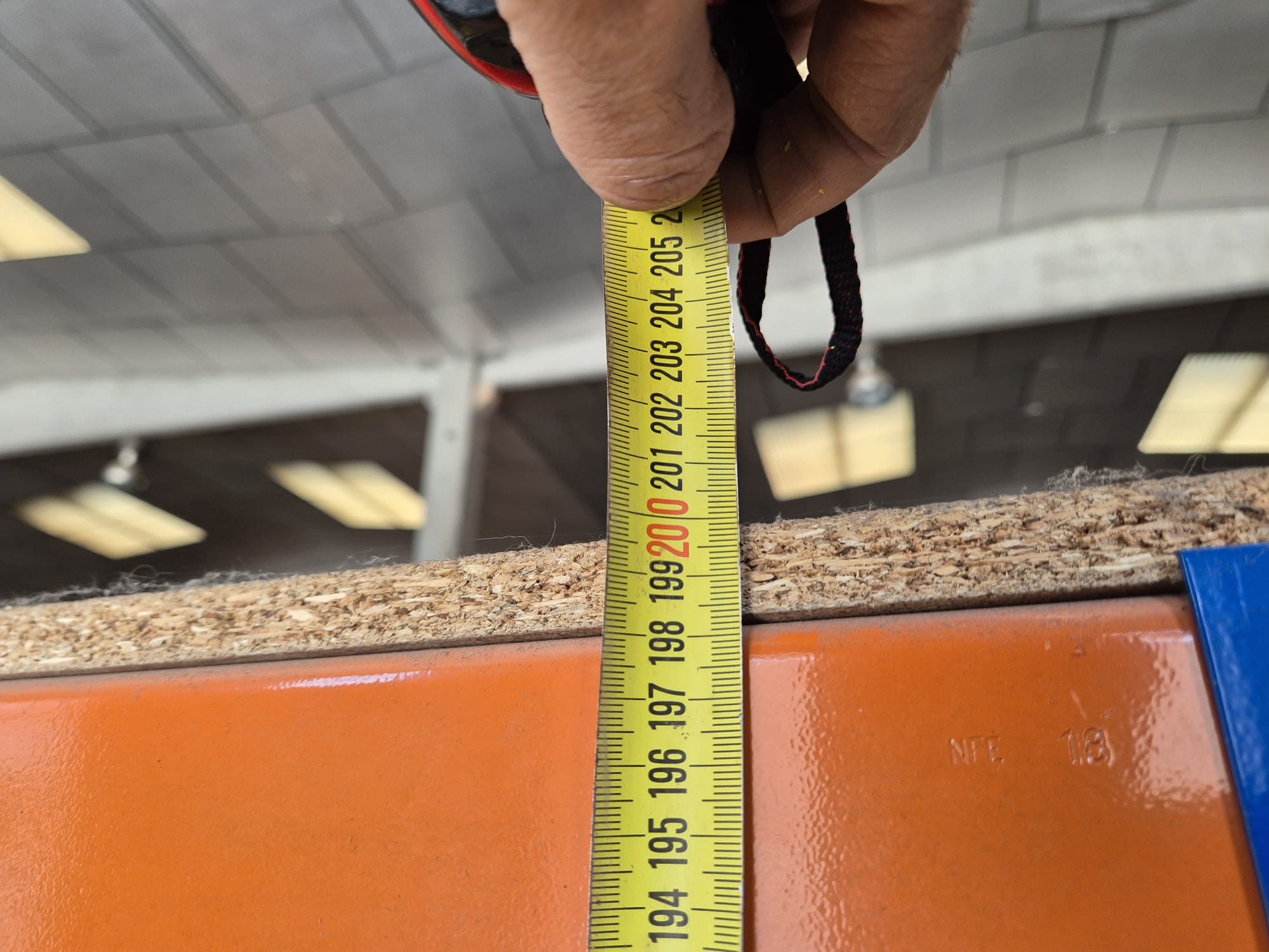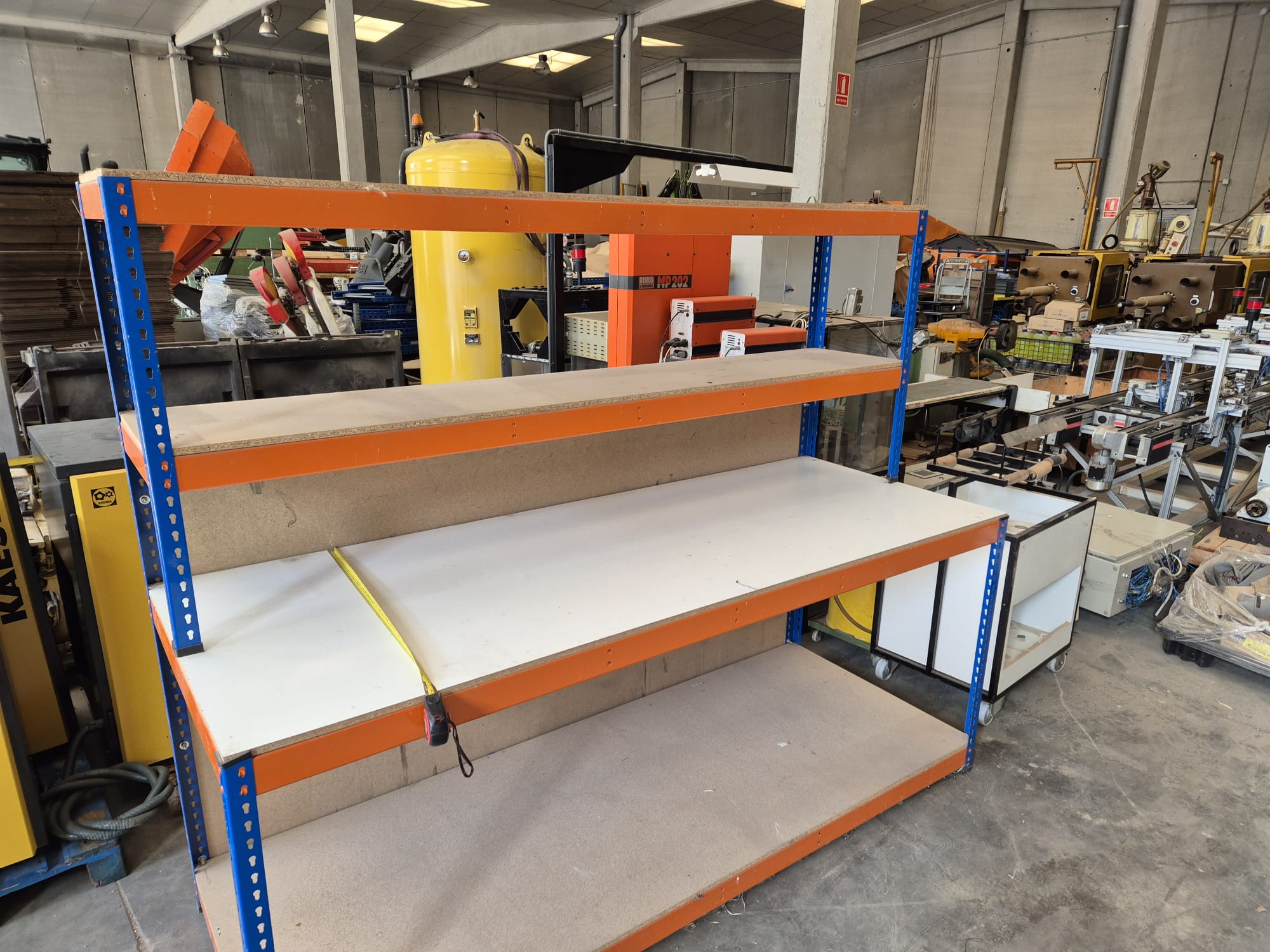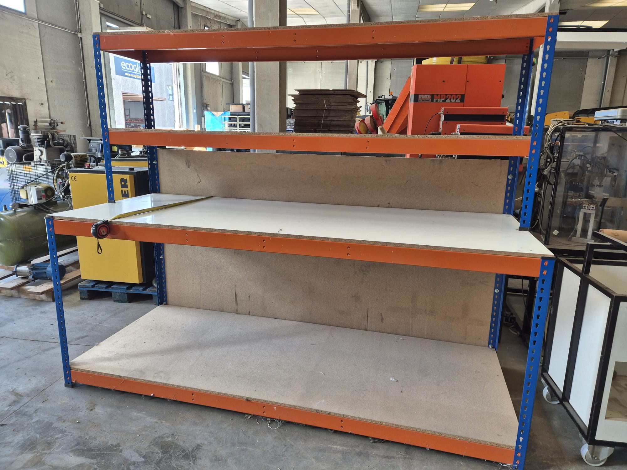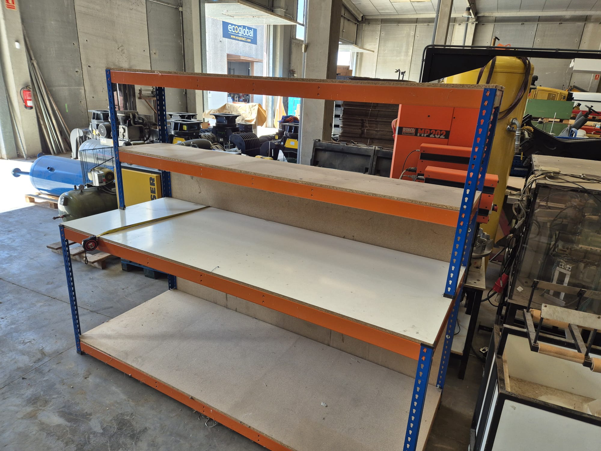 MECALUX industrial shelving/workbench with a metal frame (blue/orange) and plywood shelves, ideal for a workshop or warehouse. Dimensions: 245 cm long, 90 cm wide, and 200 cm high. Includes two usable levels: a lower shelf at 1.00 m and a second shelf at 2.00 m (total height). In good condition with normal signs of use. Can be viewed and picked up. Contact me via WhatsApp.