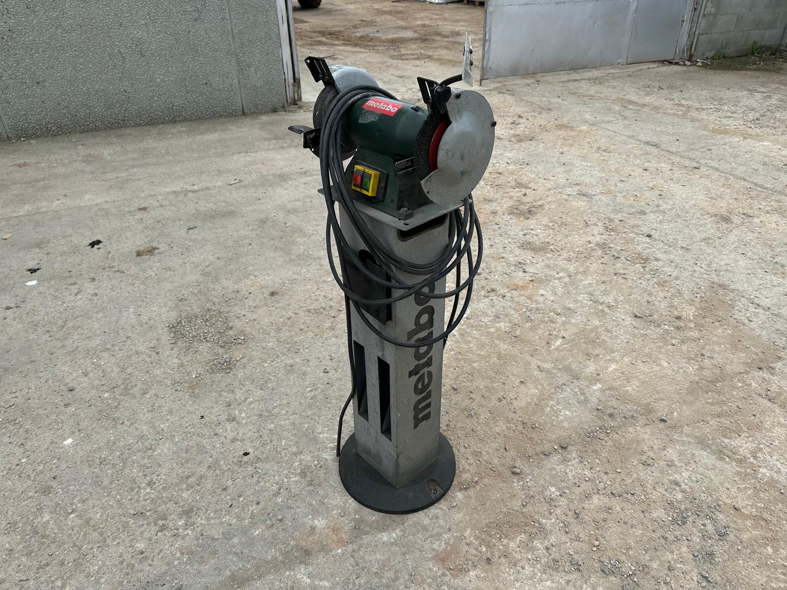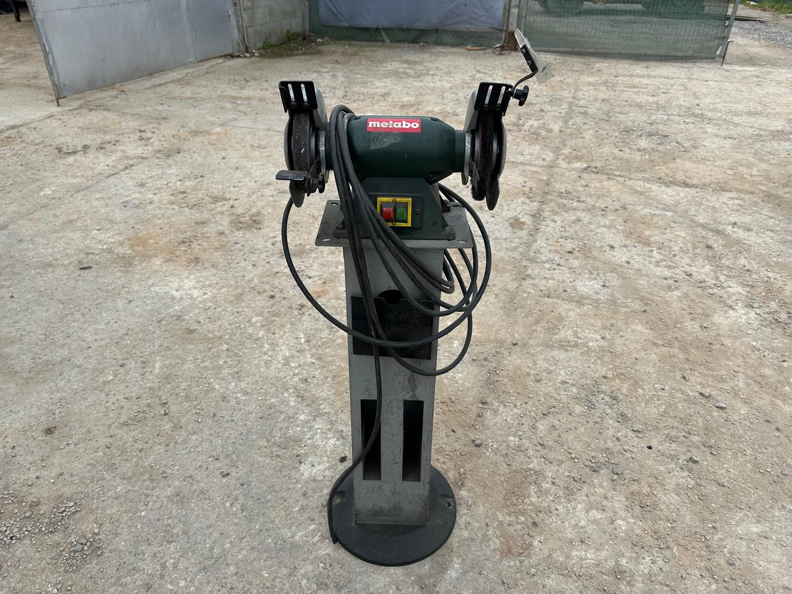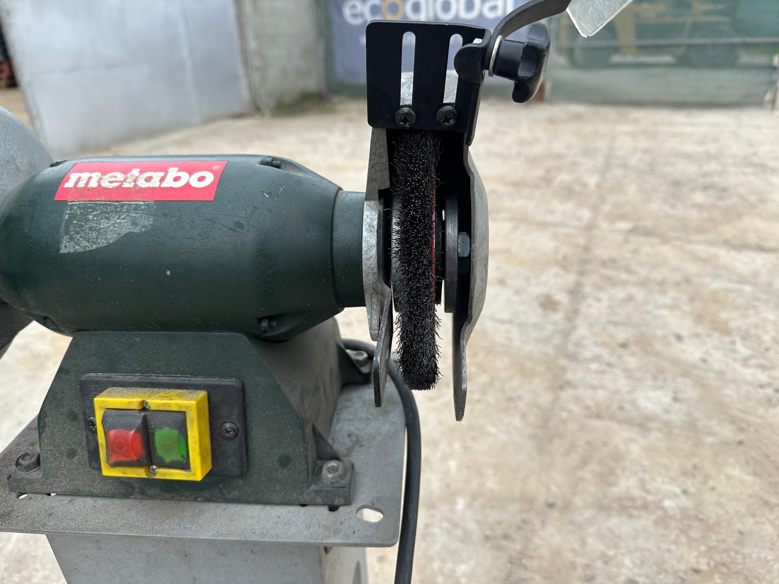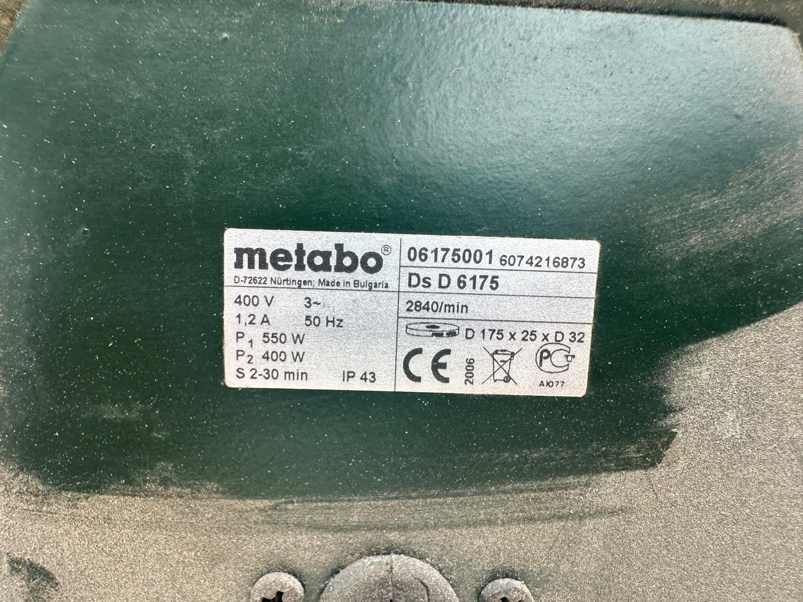 Metabo DS D 6175 bench grinder (2006 model). Three-phase 400V (3~), 50 Hz, 1.2 A. Power P1 550W / P2 400W. Speed ​​2840 rpm. IP43 protection. Mounted on a metal pedestal with an ON/OFF switch. Includes grinding wheel and wire brush. Works well; can be seen and tested. Contact me via WhatsApp.