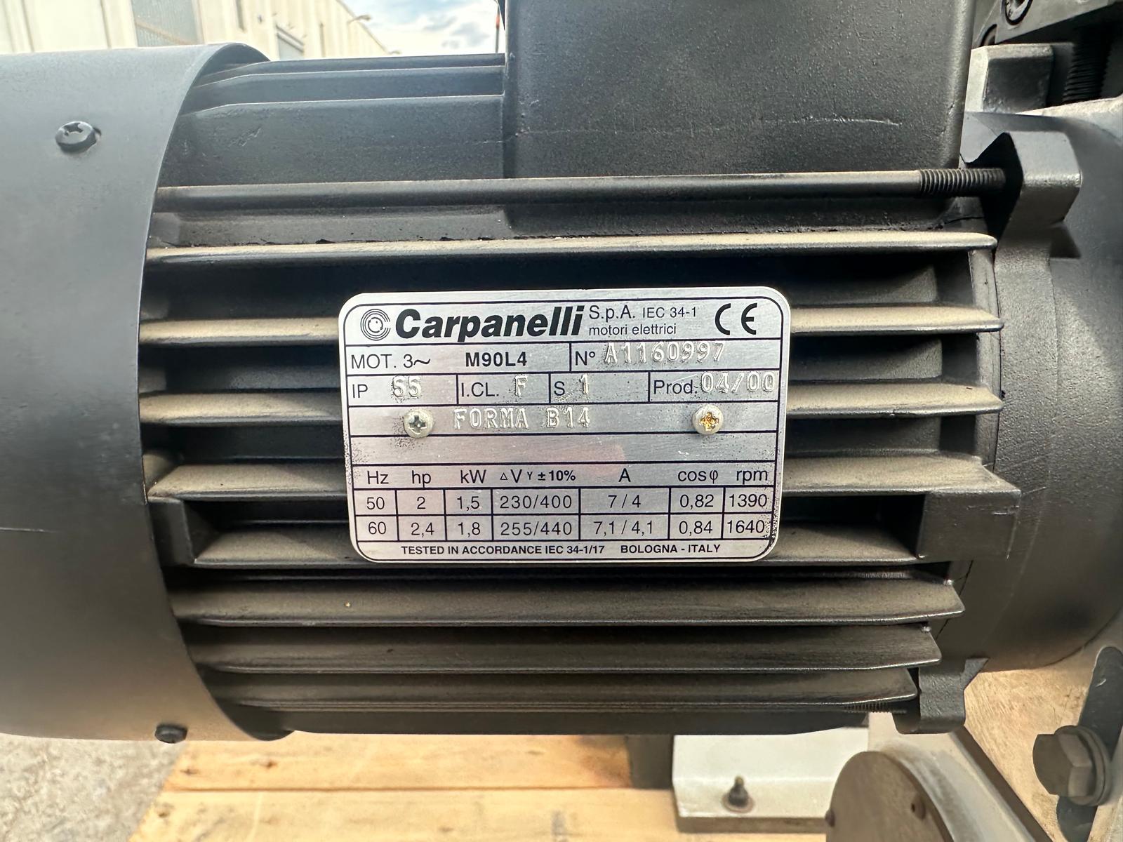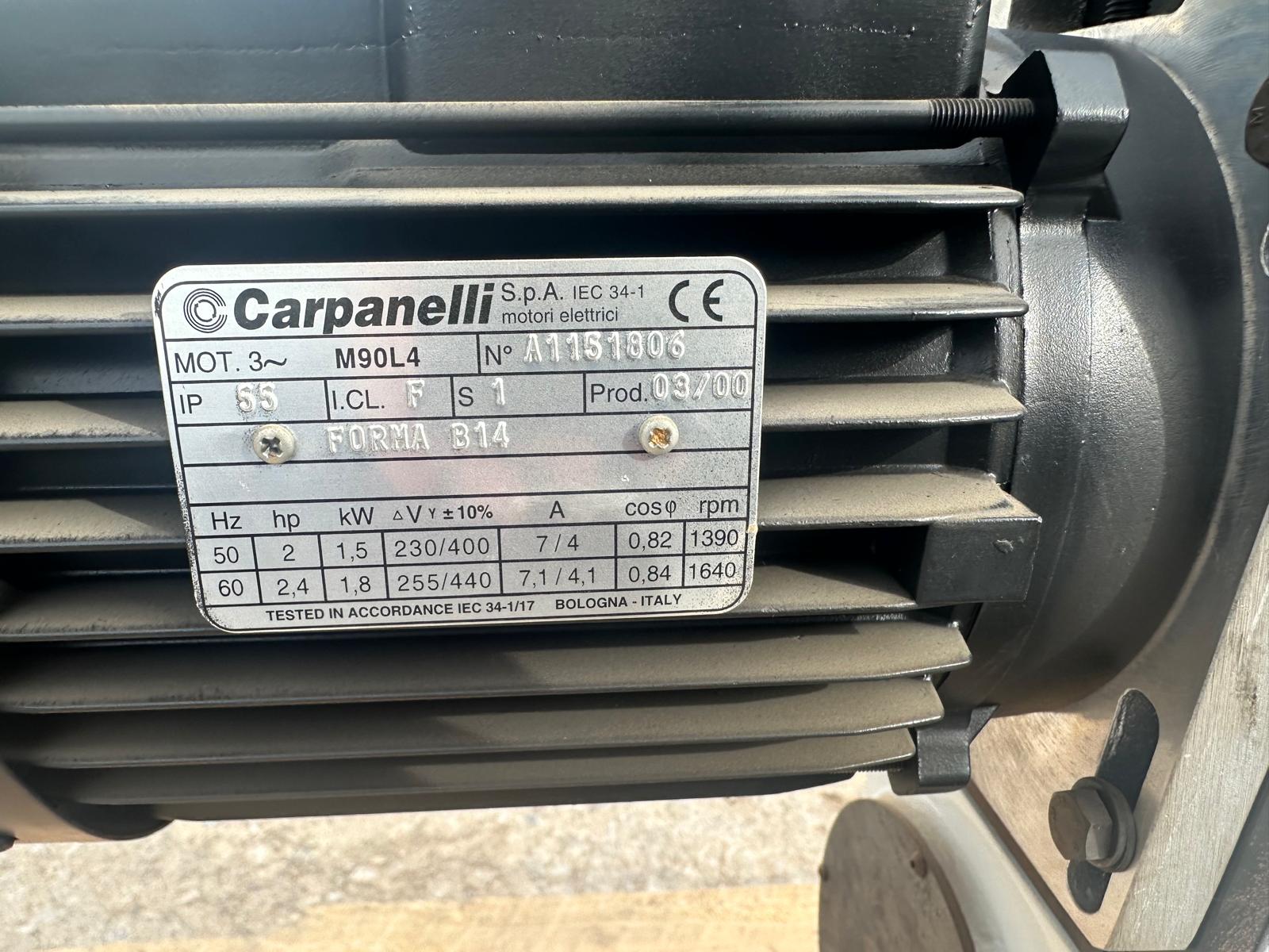 Motor eléctrico Carpanelli modelo M90L4. Fabricado en el 2000. 4 poles. 1.5Kw. Se puede ver. www.ecoglobal21.com