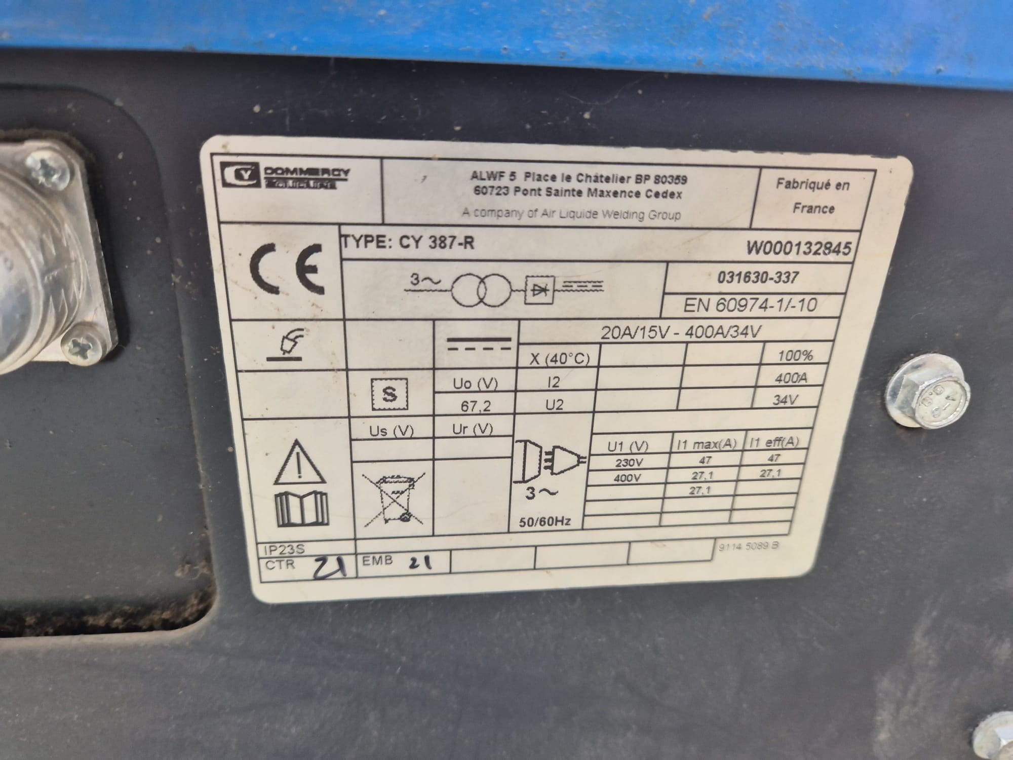 Soldador industrial MIG/MAG marca COMMERCY, modelo CY 387-R. Fabricado en Francia (grupo Air Liquide Welding). Rango de soldadura de 20 A / 15 V a 400 A / 34 V, con 400 A al 100% de ciclo de trabajo a 40 °C. Alimentación trifásica 230/400 V – 50/60 Hz. Equipo refrigerado, con carro y conexiones industriales. En buen estado general, con desgaste normal por uso. Se puede ver y probar. Atiendo por WhatsApp.